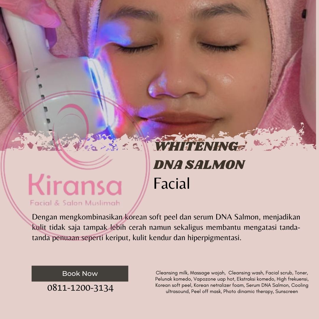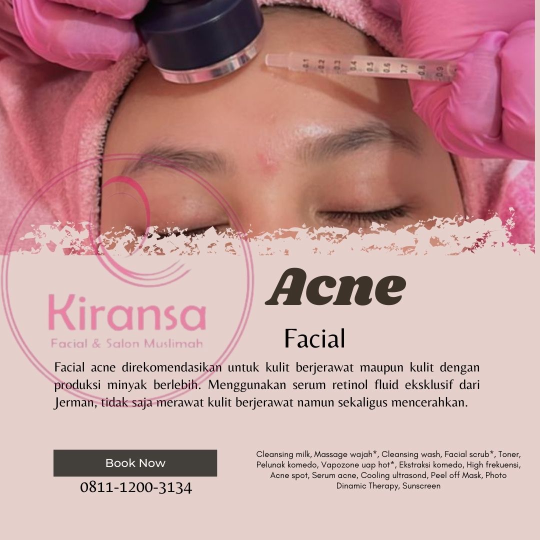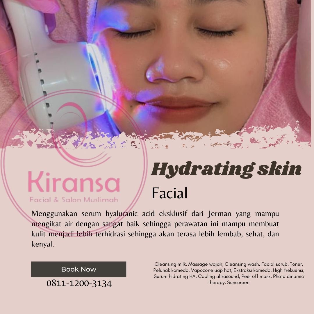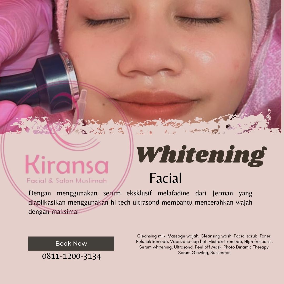 Di Kiransa Facial & Salon Muslimah, kami menawarkan berbagai jenis perawatan facial yang dirancang khusus untuk memenuhi kebutuhan kulit Muslimah dengan menggunakan produk halal dan aman. Setiap perawatan dimulai dengan konsultasi untuk memahami jenis dan kondisi kulit Anda, Kami menyediakan banyak pilihan facial untuk berbagai masalah kulit, seperti komedo, jerawat, bekas jerawat, bopeng, kulit kusam, flek dan kulit sensitif. Proses perawatan kami mencakup pembersihan, pemijatan yang menenangkan, eksfoliasi lembut, ekstraksi komedo, pemberian serum sesuai kebutuhan dengan perlengkapan hi technology serta masker yang menutrisi dan menyegarkan. Melalui sentuhan beautician kami yang berpengalaman, kami siap membantu Anda mendapatkan kulit yang lebih sehat, lebih cerah, dan bercahaya dengan tetap menjaga nilai-nilai syariah.