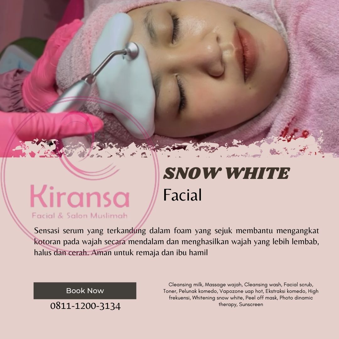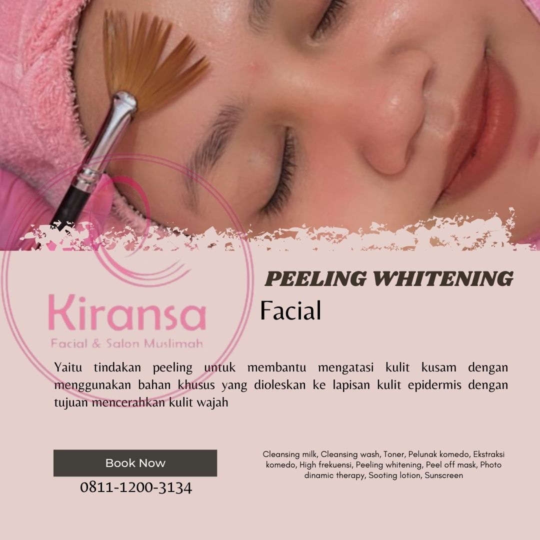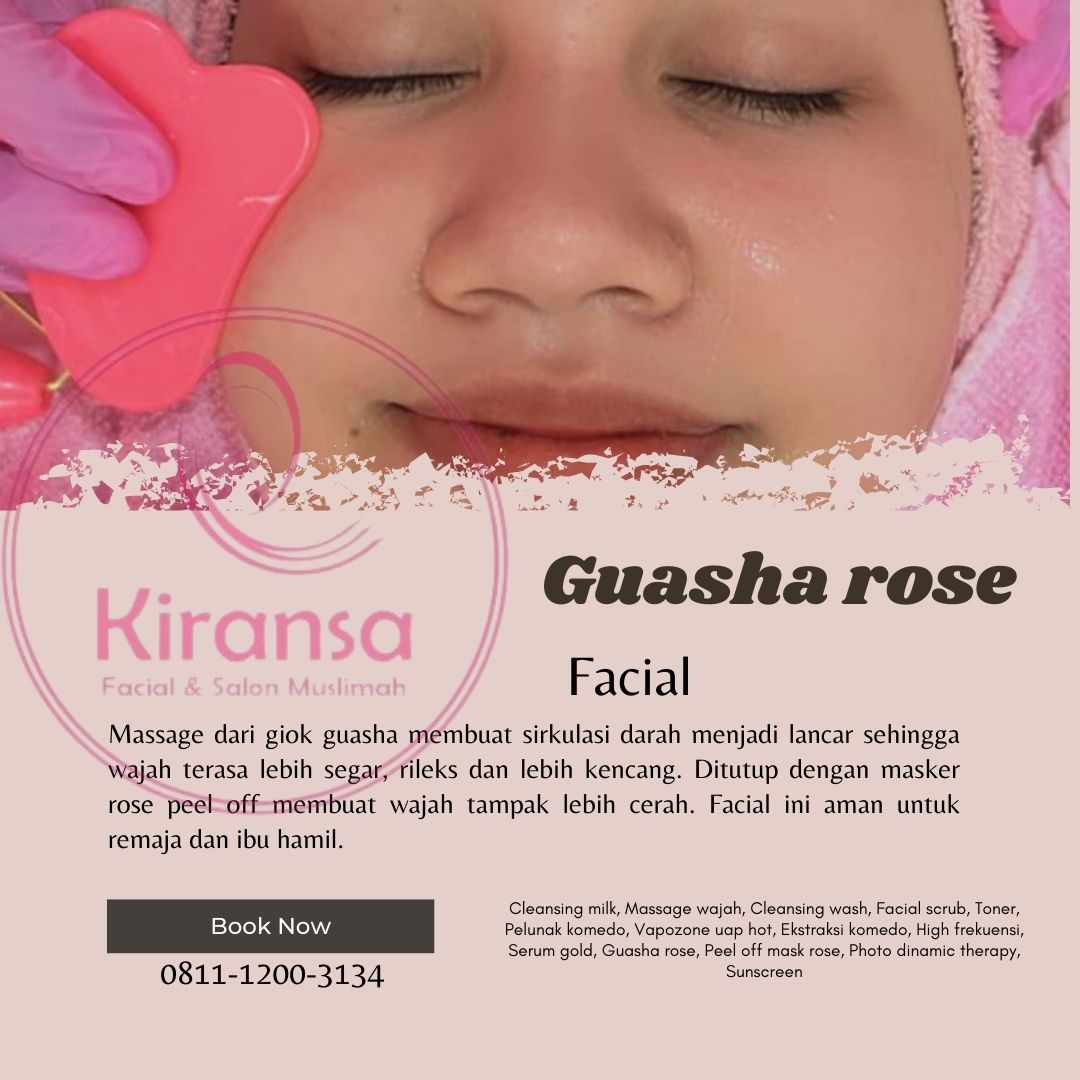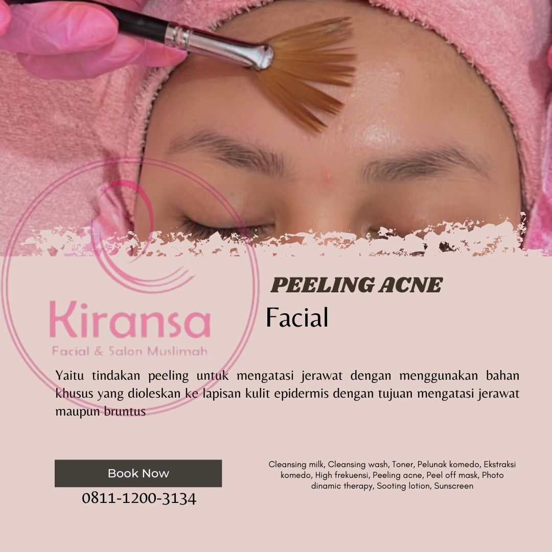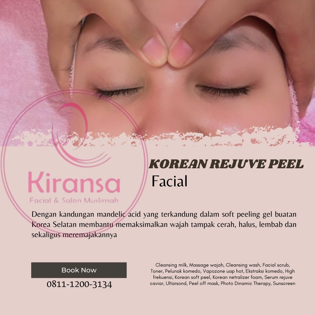 Di Kiransa Facial & Salon Muslimah, kami menawarkan berbagai jenis perawatan facial yang dirancang khusus untuk memenuhi kebutuhan kulit Muslimah dengan menggunakan produk halal dan aman. Setiap perawatan dimulai dengan konsultasi untuk memahami jenis dan kondisi kulit Anda, Kami menyediakan banyak pilihan facial untuk berbagai masalah kulit, seperti komedo, jerawat, bekas jerawat, bopeng, kulit kusam, flek dan kulit sensitif. Proses perawatan kami mencakup pembersihan, pemijatan yang menenangkan, eksfoliasi lembut, ekstraksi komedo, pemberian serum sesuai kebutuhan dengan perlengkapan hi technology serta masker yang menutrisi dan menyegarkan. Melalui sentuhan beautician kami yang berpengalaman, kami siap membantu Anda mendapatkan kulit yang lebih sehat, lebih cerah, dan bercahaya dengan tetap menjaga nilai-nilai syariah.
