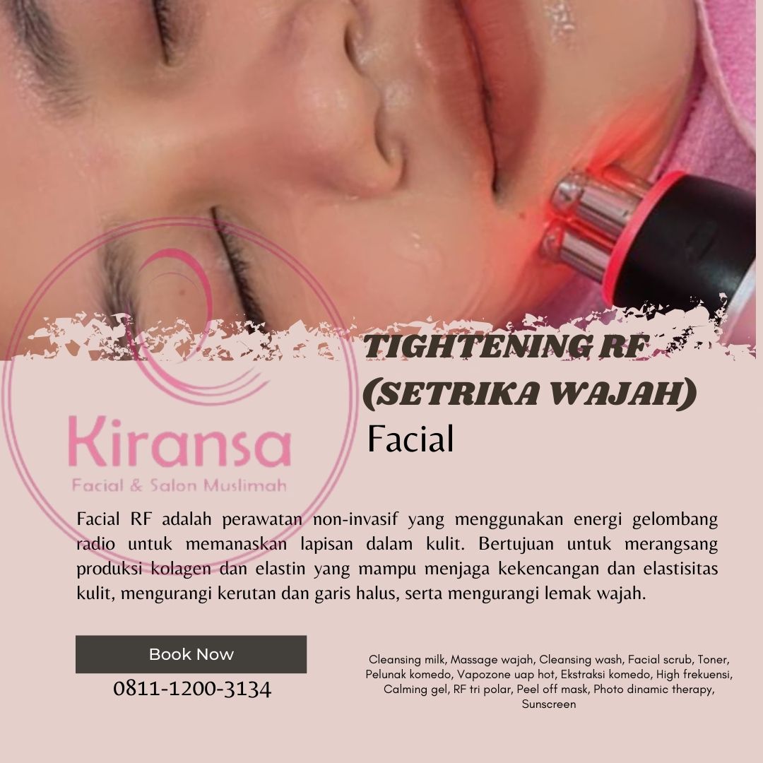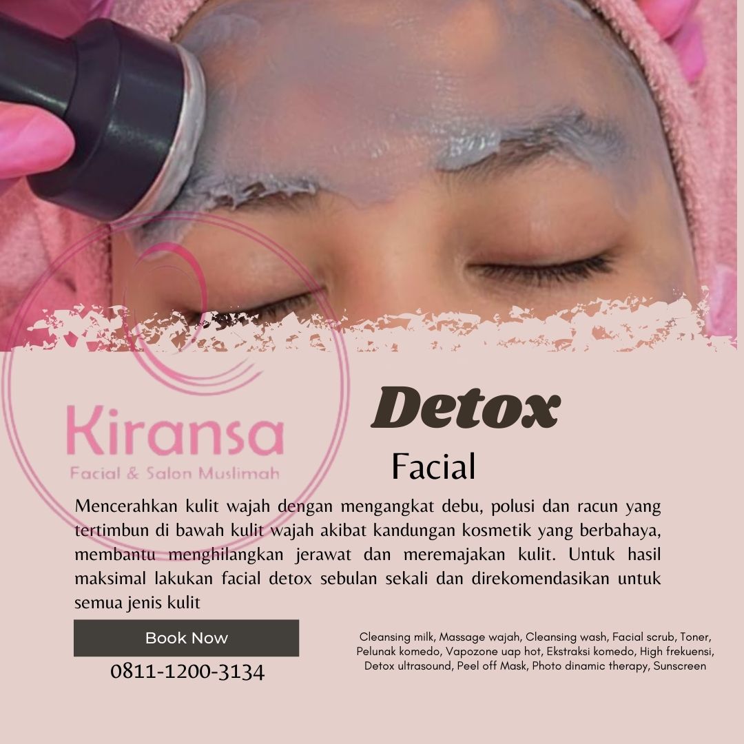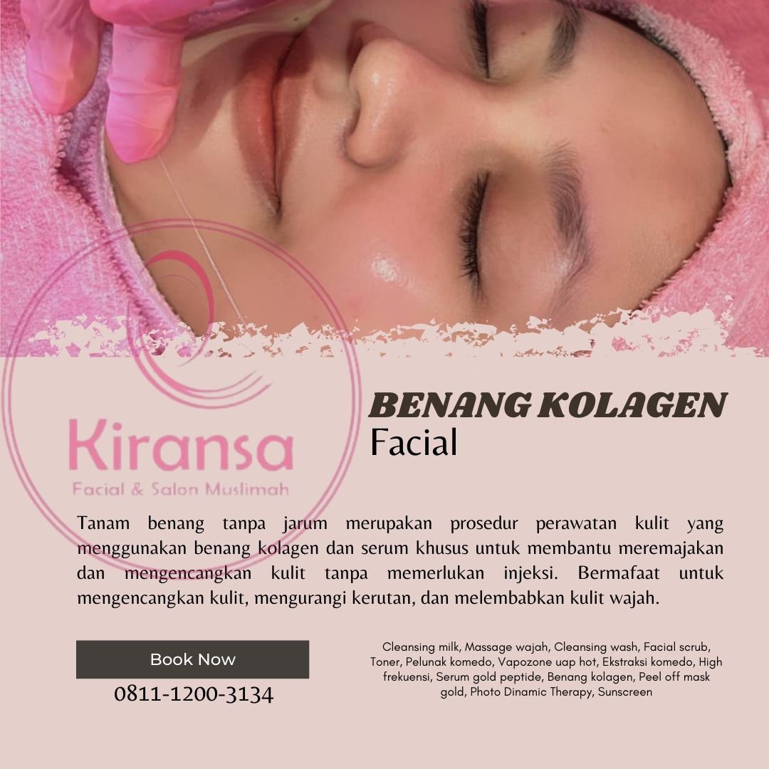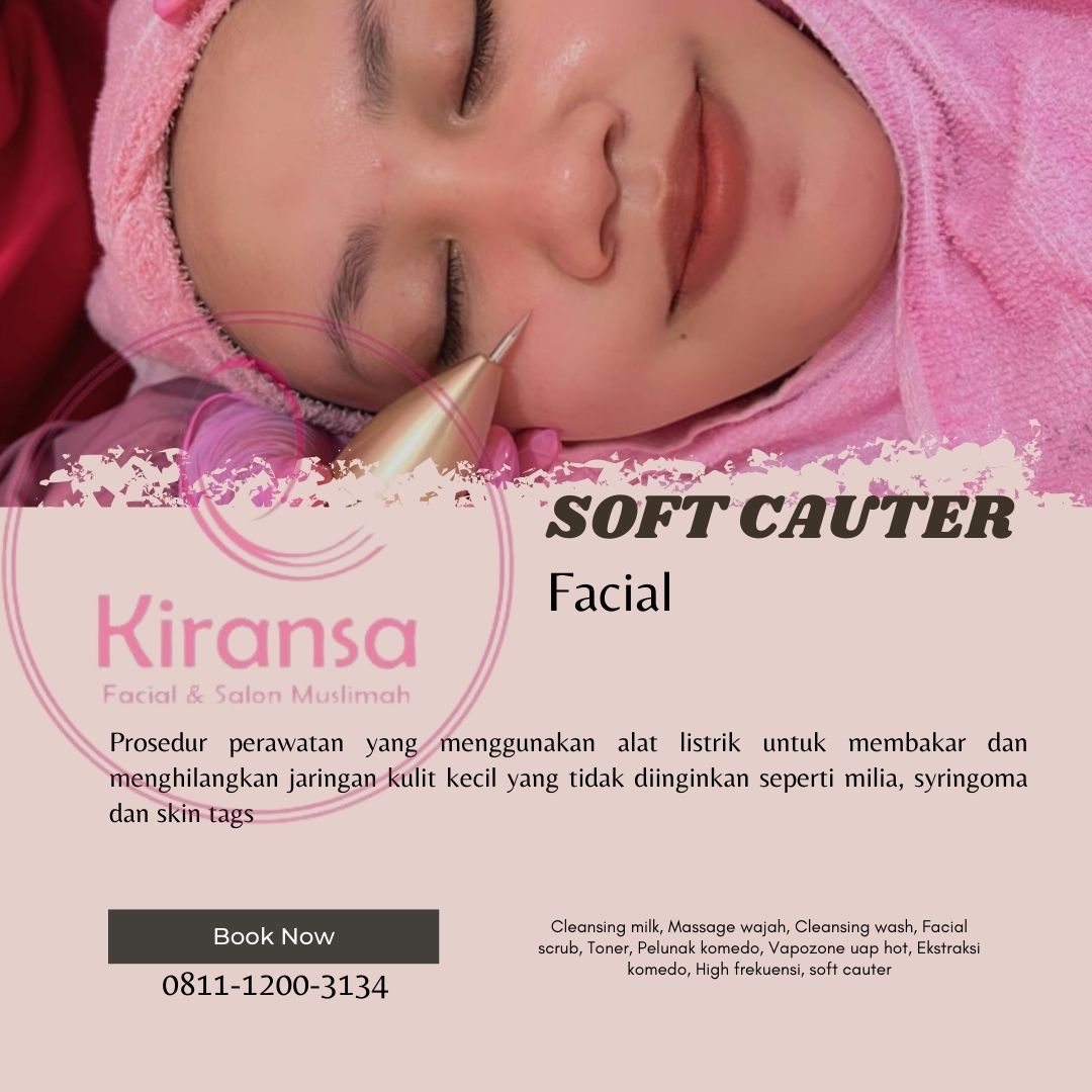 Di Kiransa Facial & Salon Muslimah, kami menawarkan berbagai jenis perawatan facial yang dirancang khusus untuk memenuhi kebutuhan kulit Muslimah dengan menggunakan produk halal dan aman. Setiap perawatan dimulai dengan konsultasi untuk memahami jenis dan kondisi kulit Anda, Kami menyediakan banyak pilihan facial untuk berbagai masalah kulit, seperti komedo, jerawat, bekas jerawat, bopeng, kulit kusam, flek dan kulit sensitif. Proses perawatan kami mencakup pembersihan, pemijatan yang menenangkan, eksfoliasi lembut, ekstraksi komedo, pemberian serum sesuai kebutuhan dengan perlengkapan hi technology serta masker yang menutrisi dan menyegarkan. Melalui sentuhan beautician kami yang berpengalaman, kami siap membantu Anda mendapatkan kulit yang lebih sehat, lebih cerah, dan bercahaya dengan tetap menjaga nilai-nilai syariah.