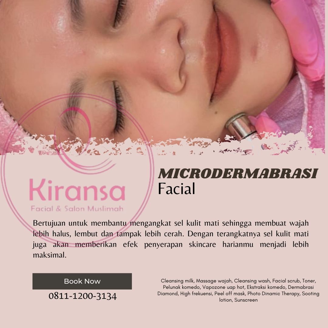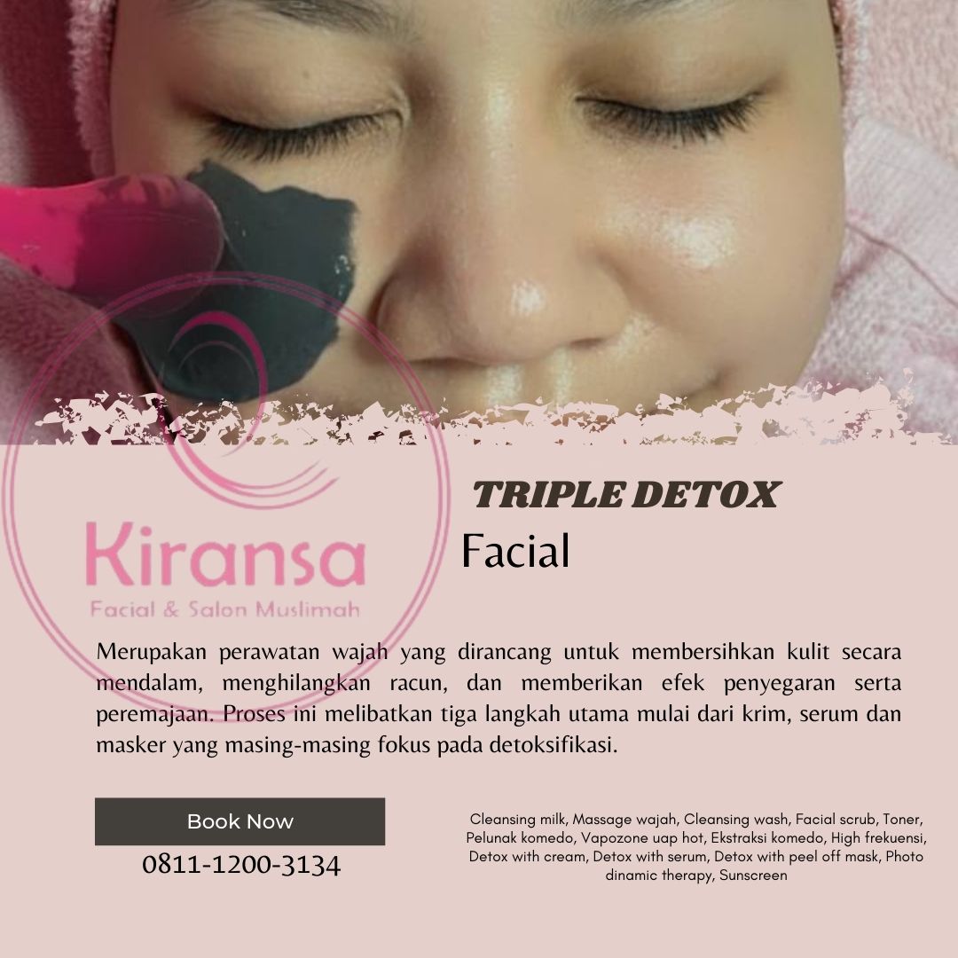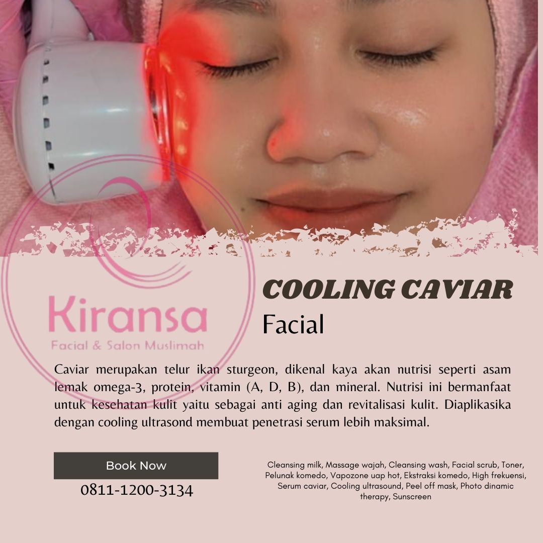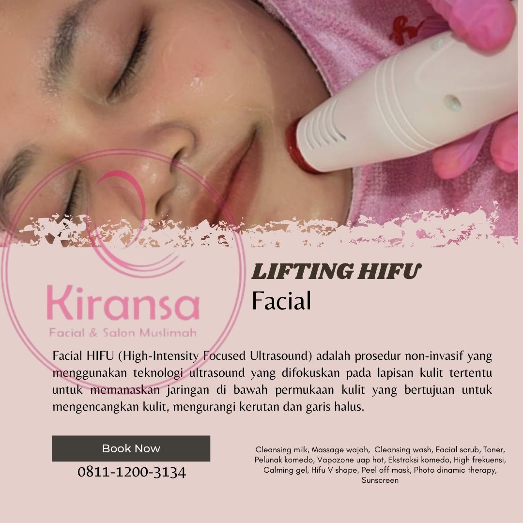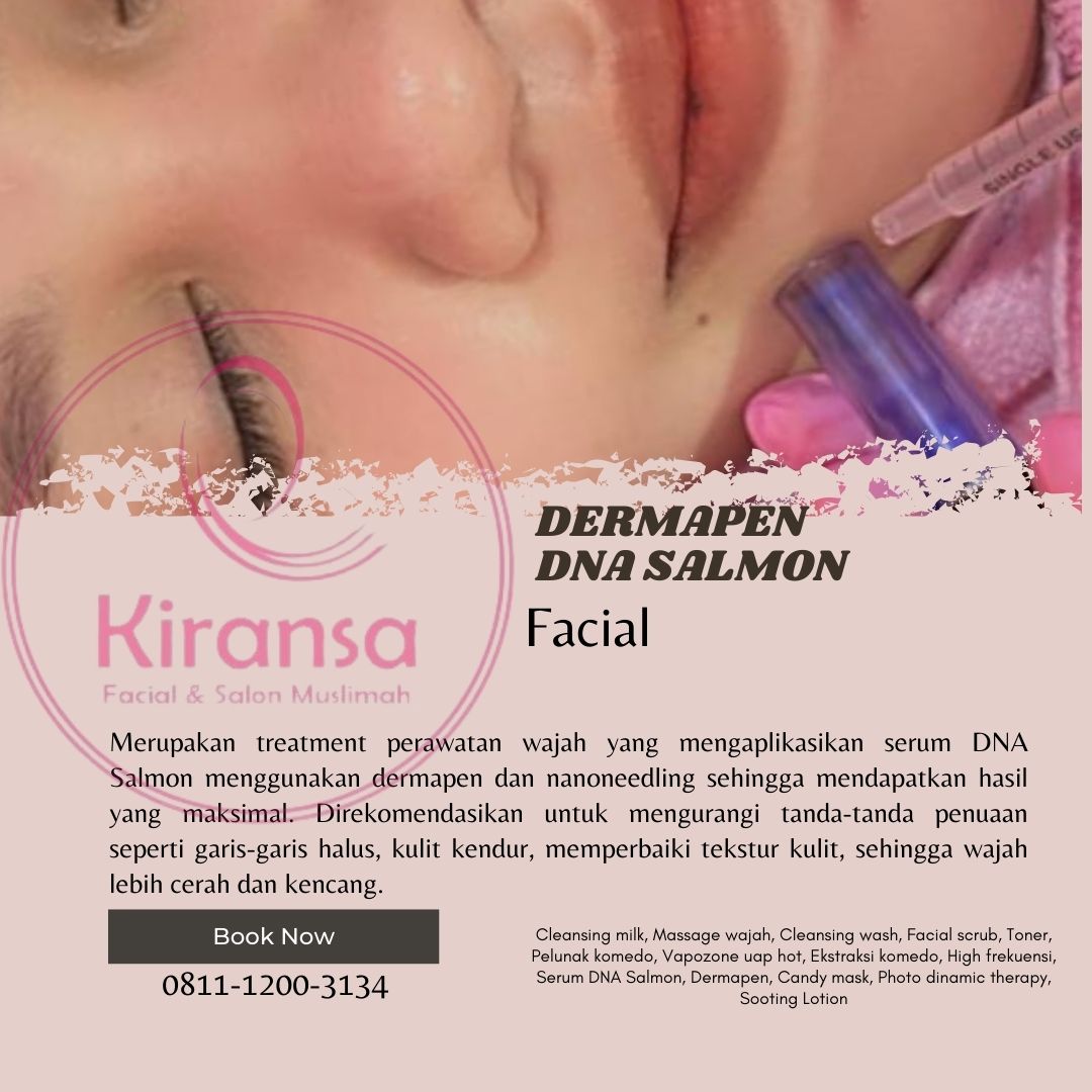 Di Kiransa Facial & Salon Muslimah, kami menawarkan berbagai jenis perawatan facial yang dirancang khusus untuk memenuhi kebutuhan kulit Muslimah dengan menggunakan produk halal dan aman. Setiap perawatan dimulai dengan konsultasi untuk memahami jenis dan kondisi kulit Anda, Kami menyediakan banyak pilihan facial untuk berbagai masalah kulit, seperti komedo, jerawat, bekas jerawat, bopeng, kulit kusam, flek dan kulit sensitif. Proses perawatan kami mencakup pembersihan, pemijatan yang menenangkan, eksfoliasi lembut, ekstraksi komedo, pemberian serum sesuai kebutuhan dengan perlengkapan hi technology serta masker yang menutrisi dan menyegarkan. Melalui sentuhan beautician kami yang berpengalaman, kami siap membantu Anda mendapatkan kulit yang lebih sehat, lebih cerah, dan bercahaya dengan tetap menjaga nilai-nilai syariah.