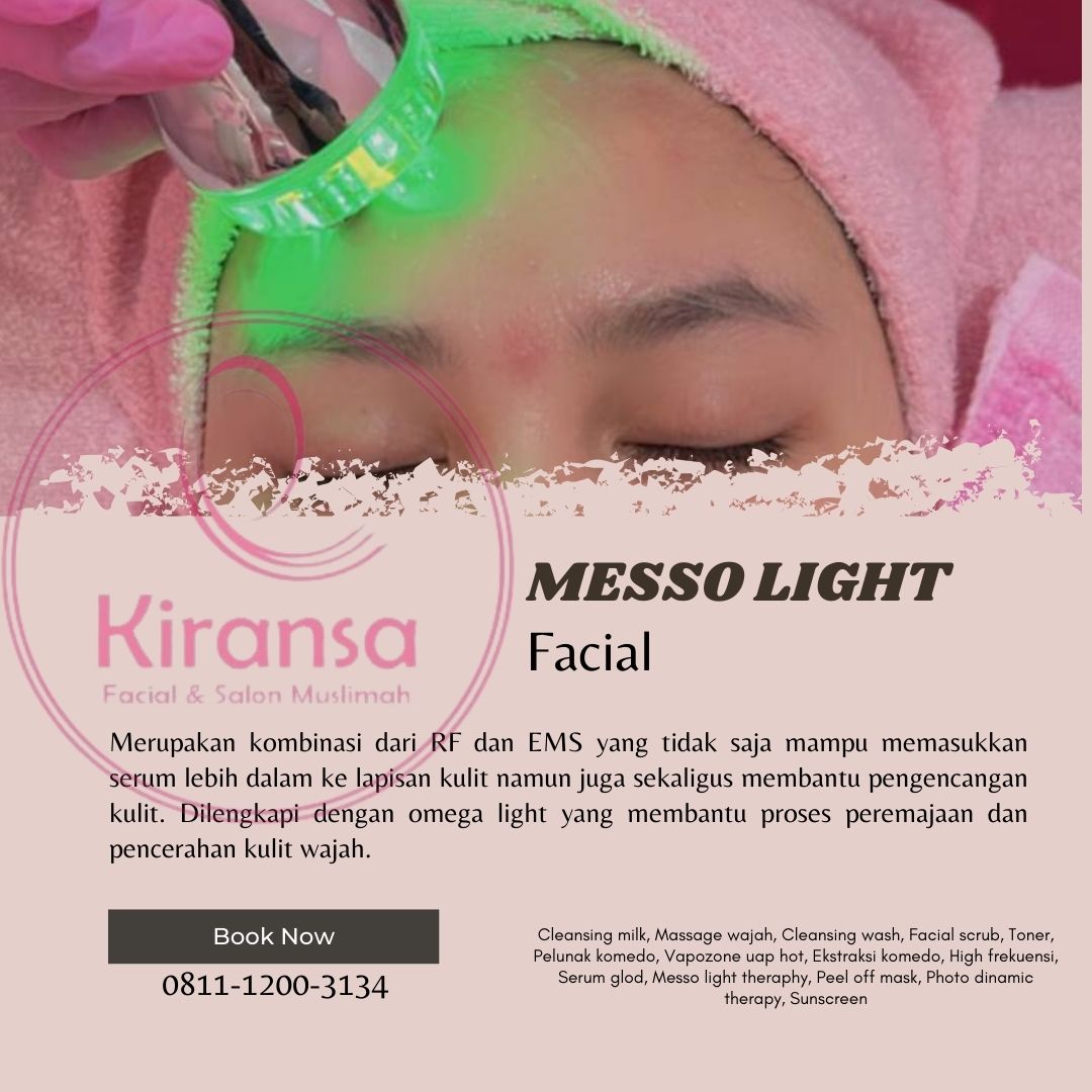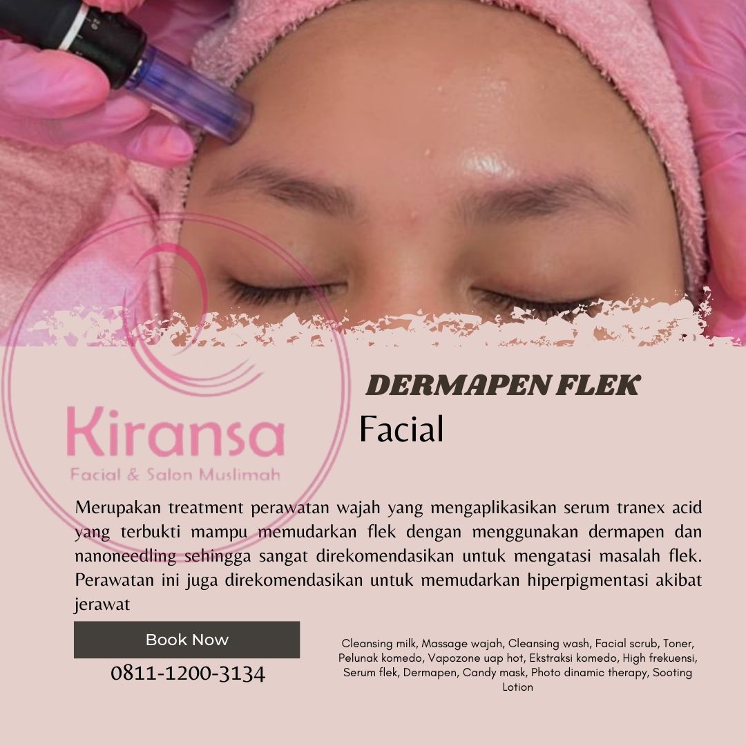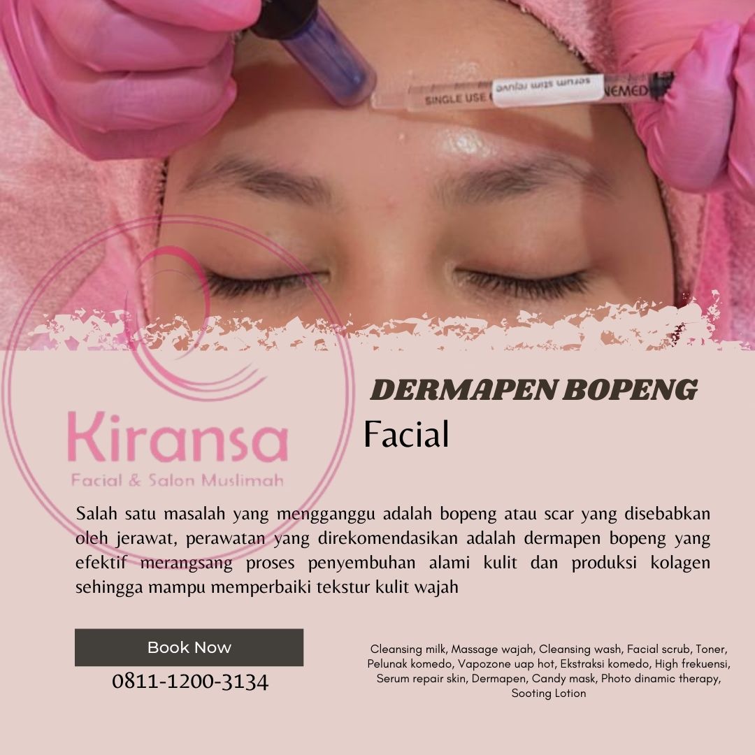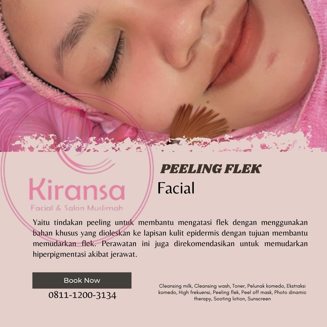 Di Kiransa Facial & Salon Muslimah, kami menawarkan berbagai jenis perawatan facial yang dirancang khusus untuk memenuhi kebutuhan kulit Muslimah dengan menggunakan produk halal dan aman. Setiap perawatan dimulai dengan konsultasi untuk memahami jenis dan kondisi kulit Anda, Kami menyediakan banyak pilihan facial untuk berbagai masalah kulit, seperti komedo, jerawat, bekas jerawat, bopeng, kulit kusam, flek dan kulit sensitif. Proses perawatan kami mencakup pembersihan, pemijatan yang menenangkan, eksfoliasi lembut, ekstraksi komedo, pemberian serum sesuai kebutuhan dengan perlengkapan hi technology serta masker yang menutrisi dan menyegarkan. Melalui sentuhan beautician kami yang berpengalaman, kami siap membantu Anda mendapatkan kulit yang lebih sehat, lebih cerah, dan bercahaya dengan tetap menjaga nilai-nilai syariah.