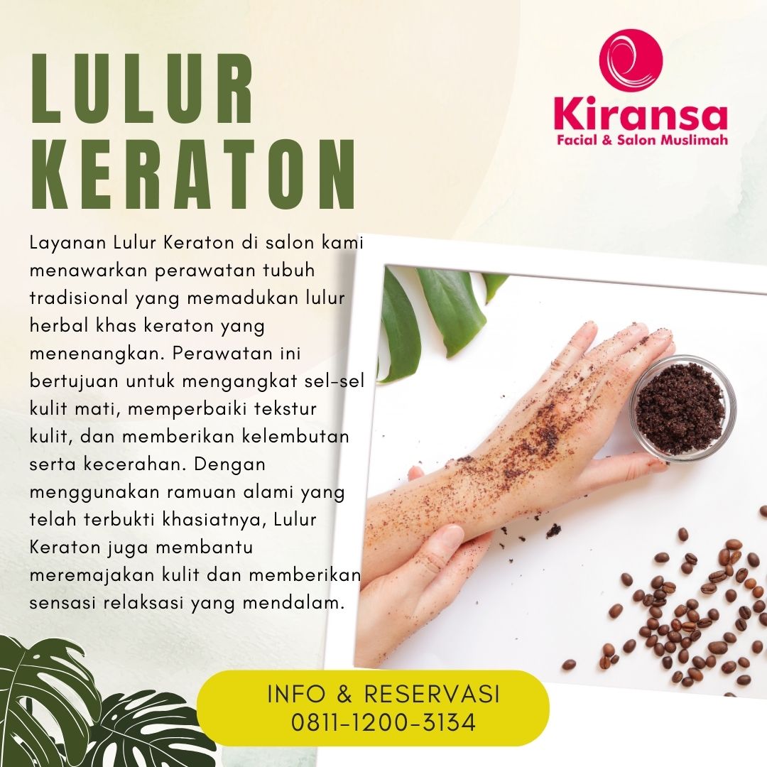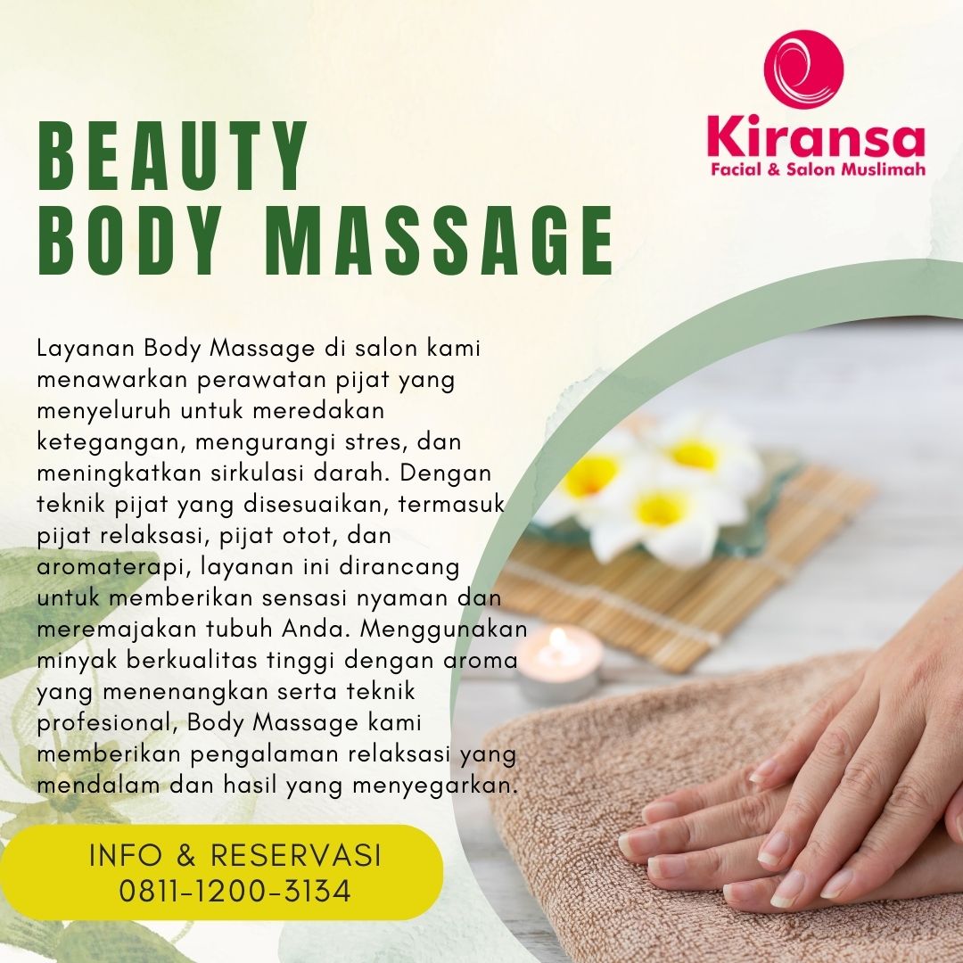 Kami percaya bahwa perawatan badan adalah bagian penting dari menjaga kesejahteraan dan kecantikan secara menyeluruh. Kami menghadirkan berbagai layanan perawatan badan meliputi body massage, lulur keraton, sauna, waxing, manicure, pedicure, ratus wangi hingga totok wajah yang dirancang untuk memberikan relaksasi, kenyamanan, dan kesegaran bagi tubuh Anda.